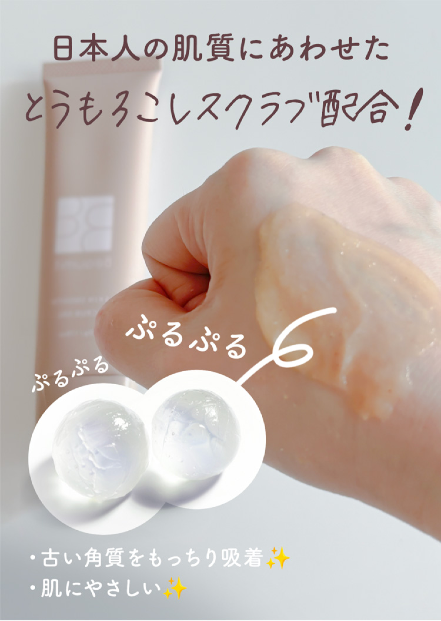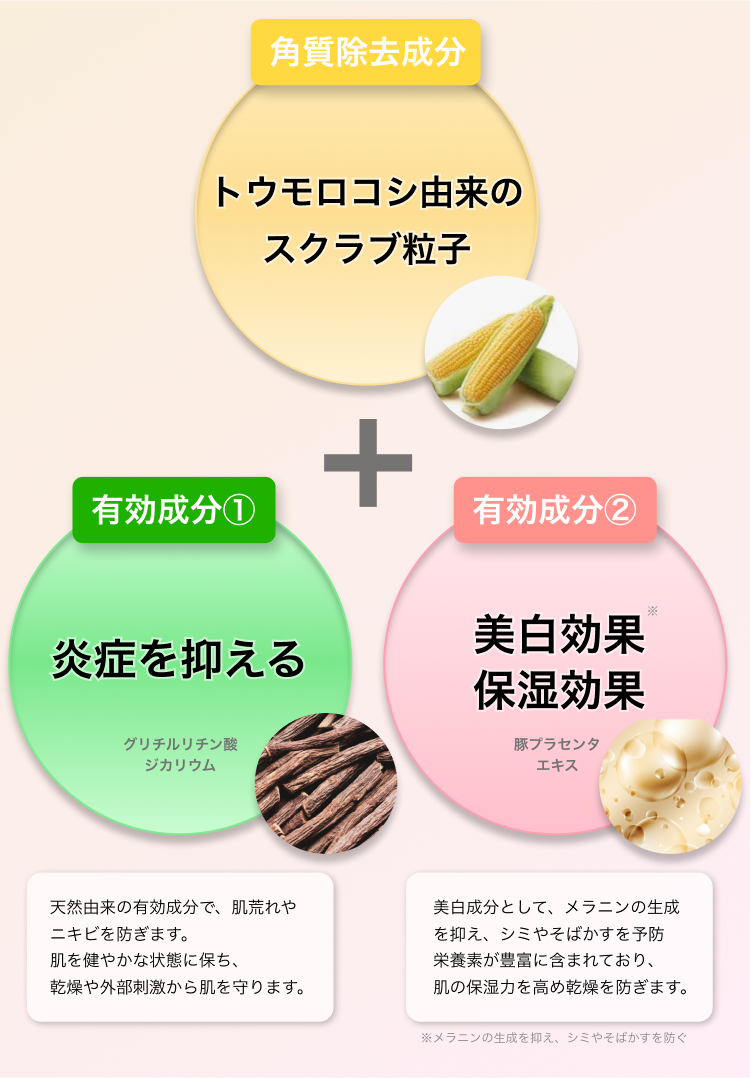 ザラつきの元となる古い角質をトウモロコシ由来のスクラブ粒子で優しく除去し、有効成分で炎症を抑え、美容成分で肌をしっとり保湿してくれます。