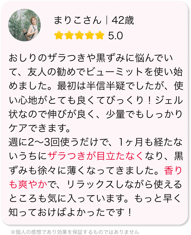 多くの方が、おしりのザラつきや黒ずみの悩みを解消し、毎日快適に過ごせているようですね!✨